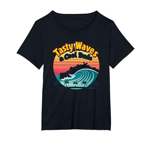 Tasty Waves & Cool Buds: Retro Surf Beach Vibes T-Shirt, Women's Plus, Black, 6X