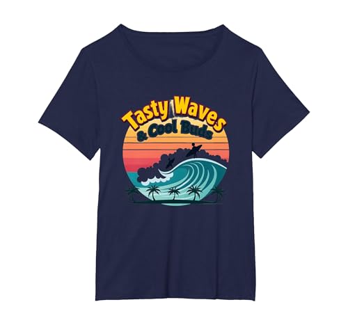 Tasty Waves & Cool Buds: Retro Surf Beach Vibes T-Shirt, Women's Plus, Navy, 6X