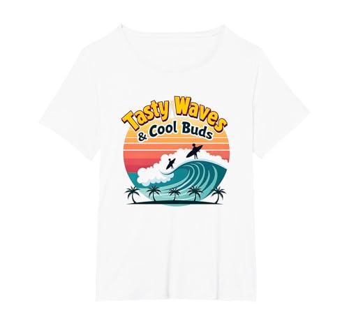 Tasty Waves & Cool Buds: Retro Surf Beach Vibes T-Shirt, Women's Plus, White, 6X