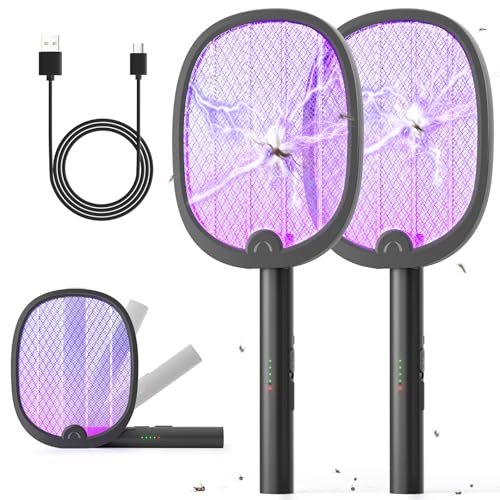 YISSVIC Electric Fly Swatter Foldable Fly Zapper Killer 4000V Mosquito Bug Zapper Racket 1800mAh Rechargeable with USB-C Cable for Indoor Home Outdoor Black 2 Pack