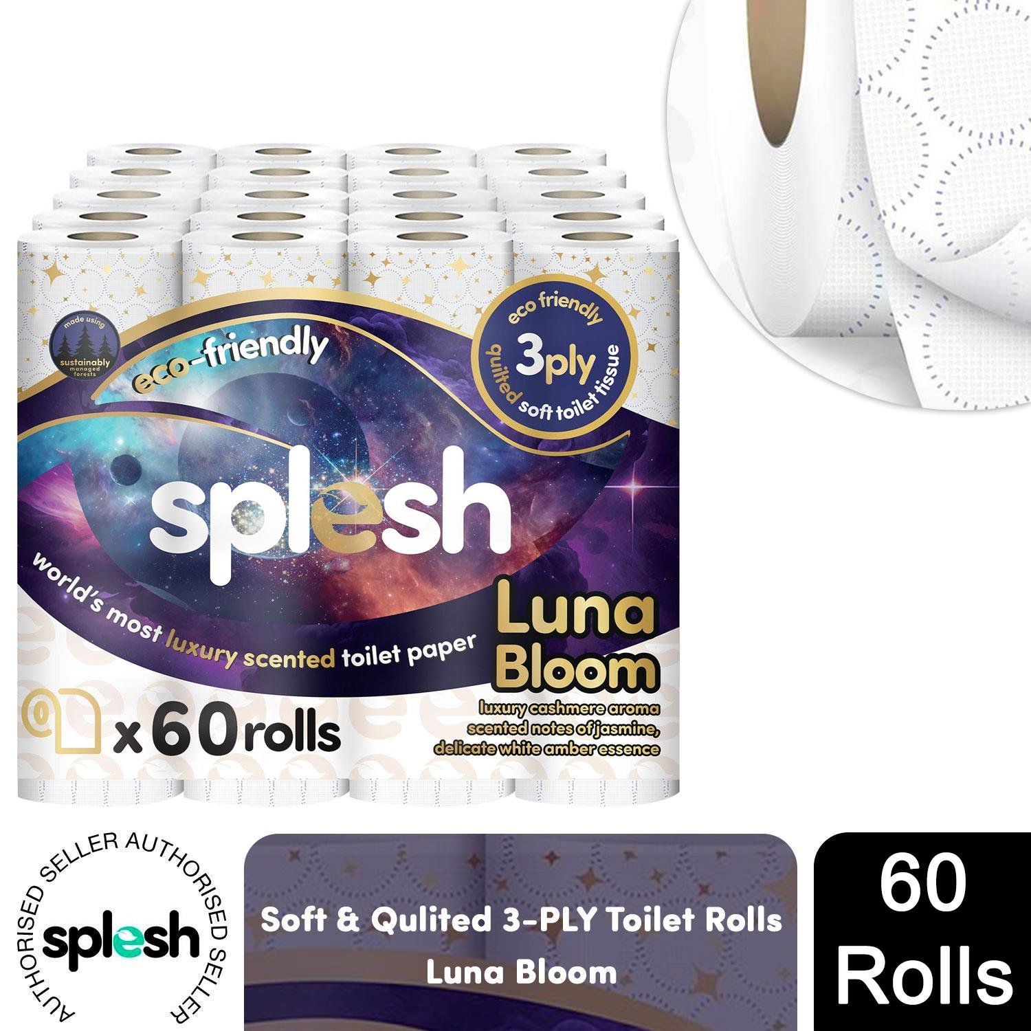 Splesh by Cusheen 3-ply Toilet Roll - Luna Bloom (60 Pack) Soft, Quilted Bulk Toilet Rolls, Toilet Tissue and Loo Rolls – Eco-Friendly Toilet Paper Sustainably Crafted in The UK