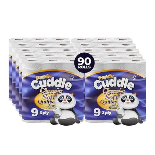 Panda Cuddle 3‑Ply Quilted Toilet Paper – Ultra Soft & Gentle Bulk Loo Rolls, Mega Value Pack of 90 Rolls, Sustainable Gentle Bathroom Tissue & Unscented- 90 Pack Bulk Bathroom Tissue