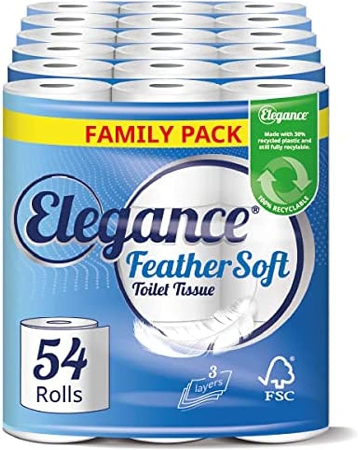 Elegance Feather Soft Toilet Roll - Bulk Buy Pack of 54 Rolls - Ultra Soft, 3-Ply, Recycled, Eco-Friendly, UK Manufactured