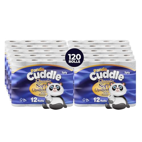 Panda Cuddle 3‑Ply Quilted Toilet Paper – Ultra Soft & Gentle Bulk Loo Rolls, Bulk Bathroom Tissue - Maxi Value Pack of 120 Rolls, Sustainable Gentle Bathroom Tissue, Unscented - Pack of 120
