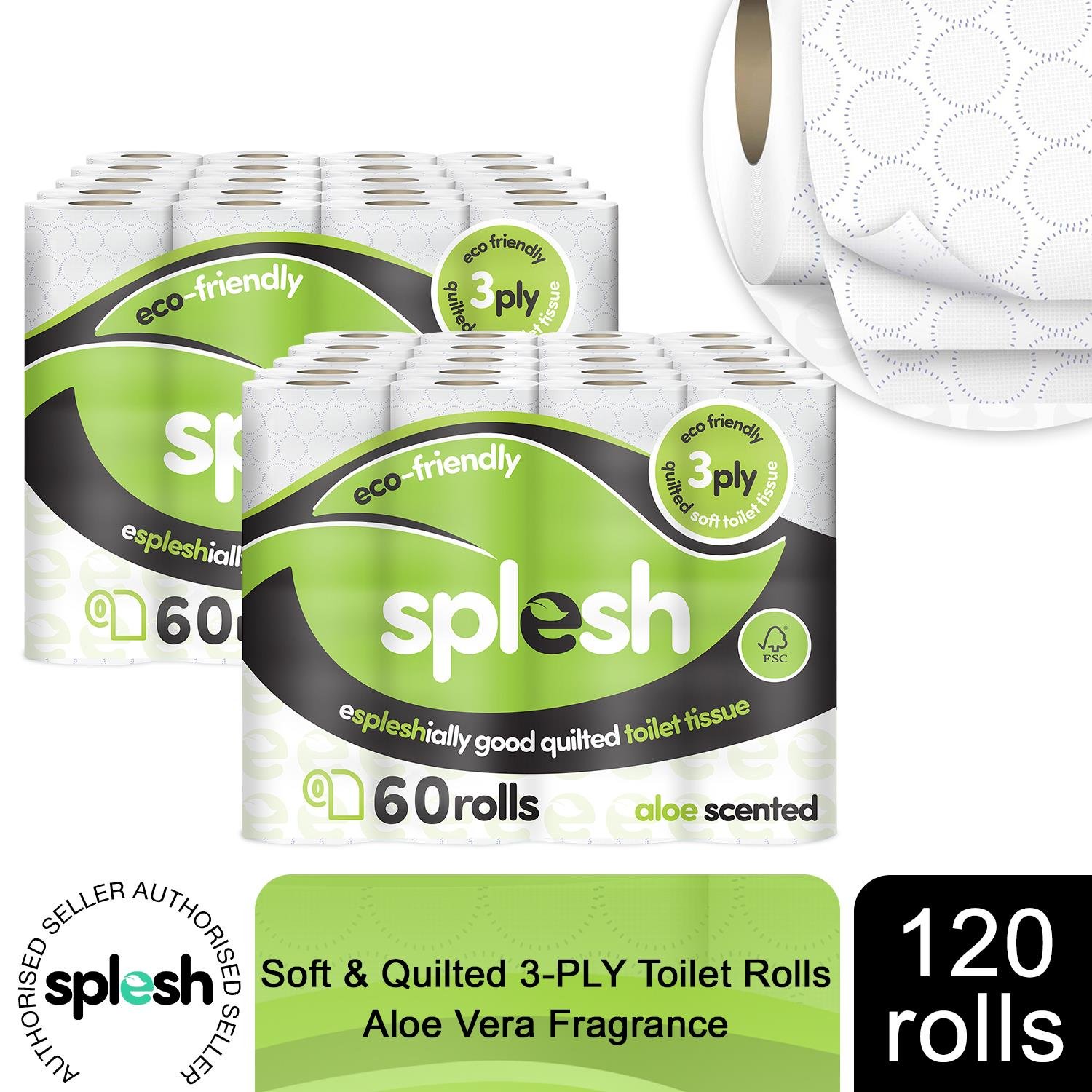 Splesh by Cusheen 3-ply Toilet Roll - Aloe Vera Fragrance (60 Pack) Soft, Quilted Bulk Toilet Rolls, Toilet Tissue and Loo Rolls – Eco-Friendly Toilet Paper Sustainably Crafted in The UK