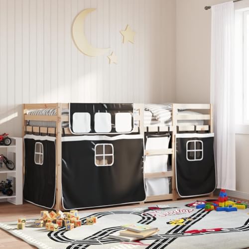 Teenpull Solid Pine Wood Bunk Bed with Curtains White Black 90 x 200 cm Cot Frame Sturdy Furniture Set Safe Base for Bedroom Space Saving Solution for Children