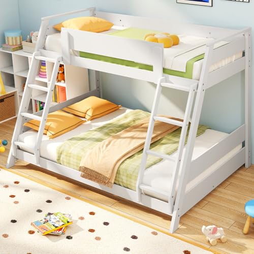 COSTWAY Wood Bunk Bed, Single over Double Loft Bed Frame with 2 Ladders, Safety Guardrails, Space-Saving High Sleeper Beds for Kids Teens Adults (White)