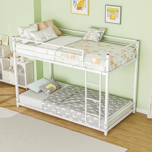 Twin Over Twin Bunk Bed, Heavy Duty Metal Single Bunk Bed Frame, Single over Single Loft Bed Frame with Ladder and Safety Guardrail, Space Saving High Sleeper Beds for Kids, Teens & Adults (White)