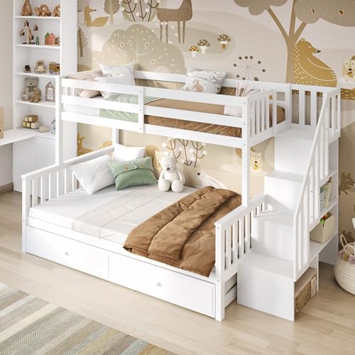 (White, Foam Mattress) Wooden Bunk Bed Kors with Trundle and Storage