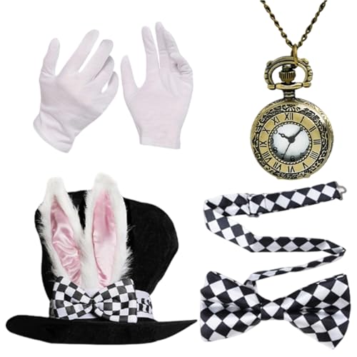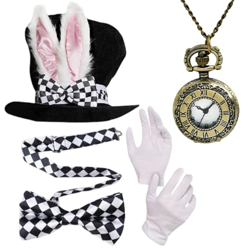 Bunny Costume - Bunny Dress Up Set | Halloween Bunny Costume | Rabbit Nose Bow Tie Gloves Easter | Bunny Top Hat Bow Tie Round Glass Clock Prop