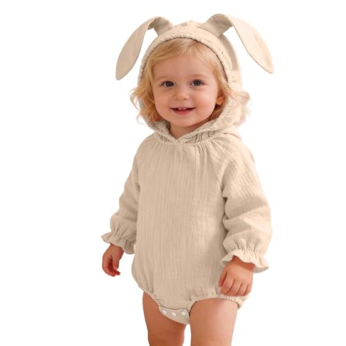 Unisex Baby Easter Outfit 3D Bunny Ear Hooded Jumpsuit Long Sleeve Romper with Zipper, Soft Cotton Bodysuit for Newborn Infant Toddler Boys Girls Beige