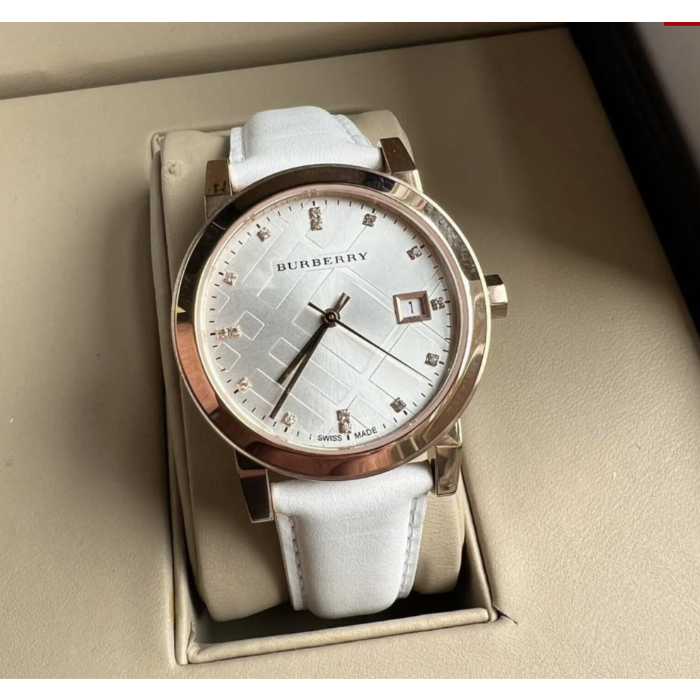 NEW BURBERRY BU9110 THE CITY GOLD WHITE TONE LEATHER STRAP WOMEN WATCH