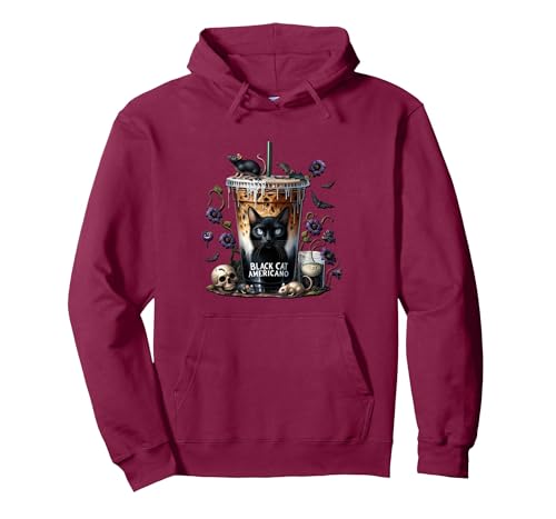 Creepy Coffee Cup Graphic For Women Men Black Cat Halloween Pullover Hoodie, Adult Unisex, Burgundy, Small