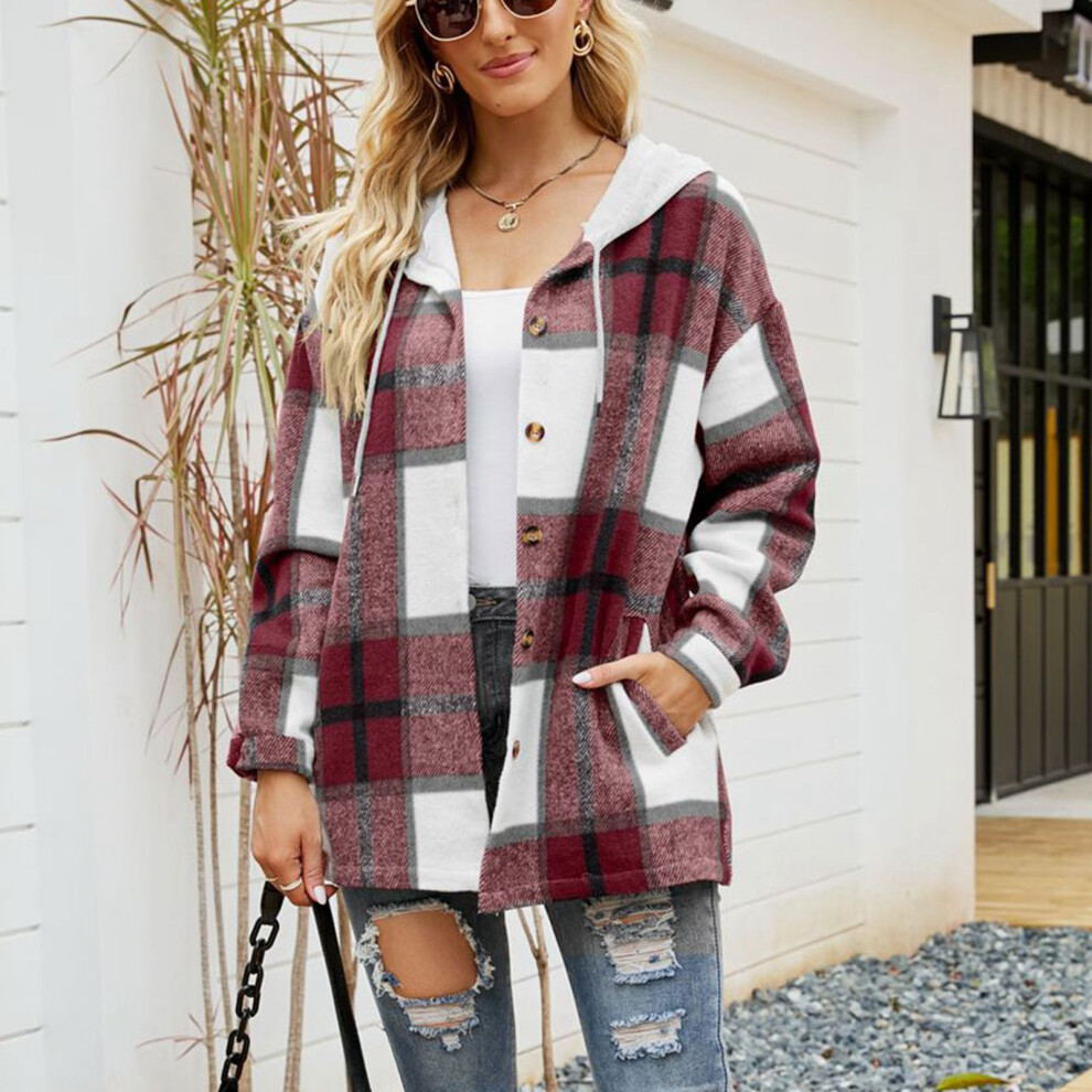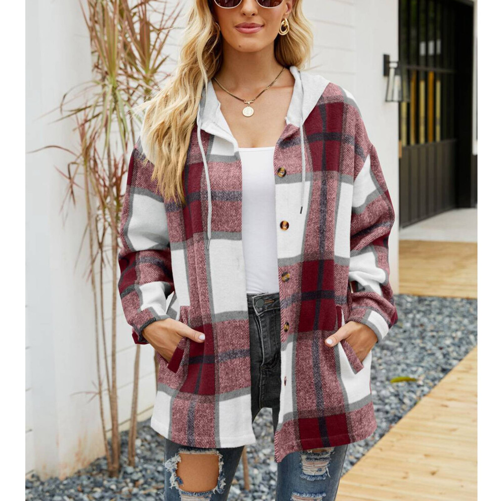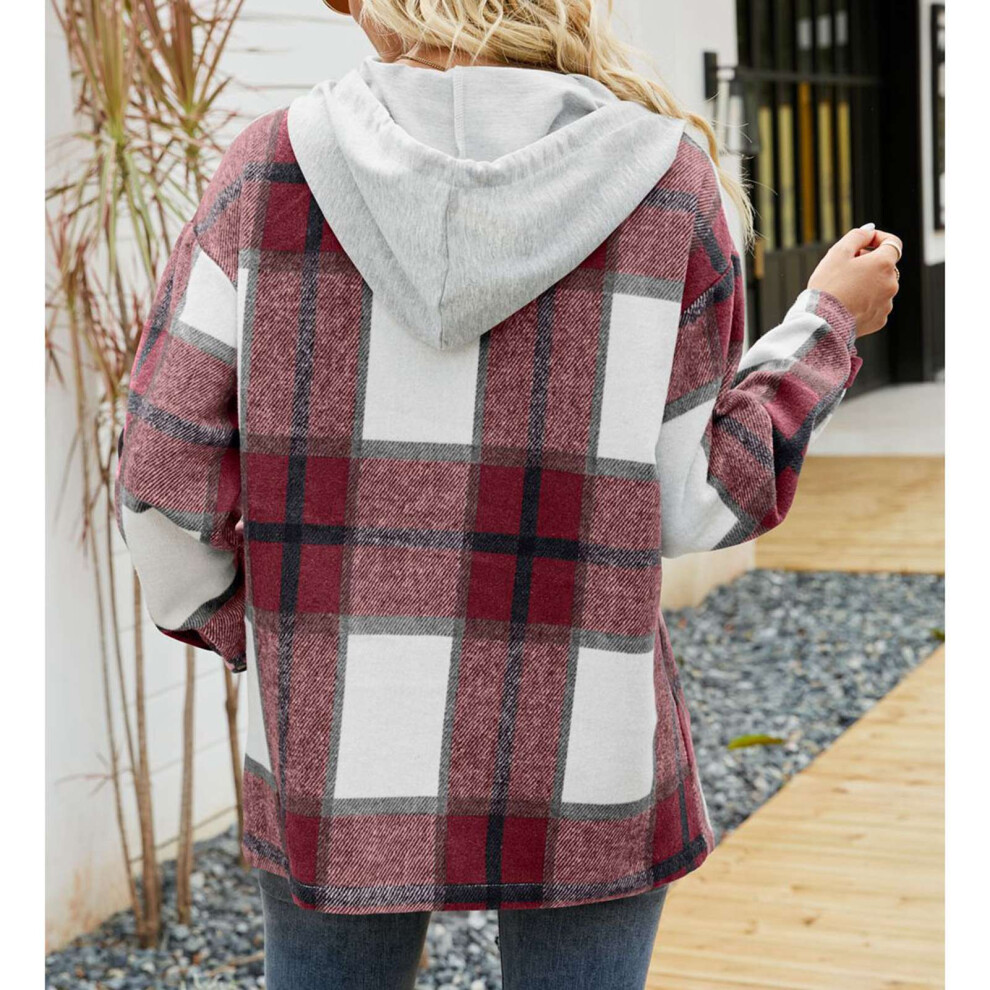 Women Plaid Hoodie Coat Polyester S-XL Burgundy