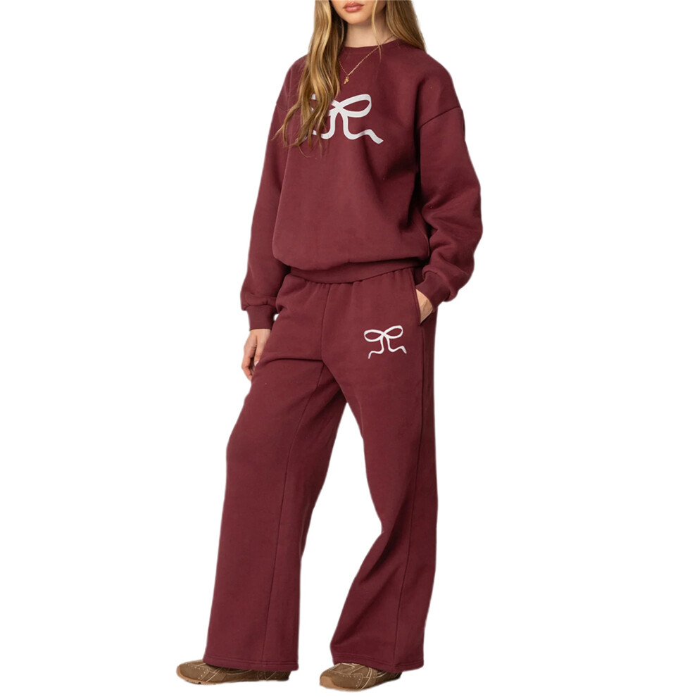 (S, Burgundy) Women Pants Set, Bow Print Long Sleeve Crew Neck Hoodie and Sweatpants Set Activewear Set