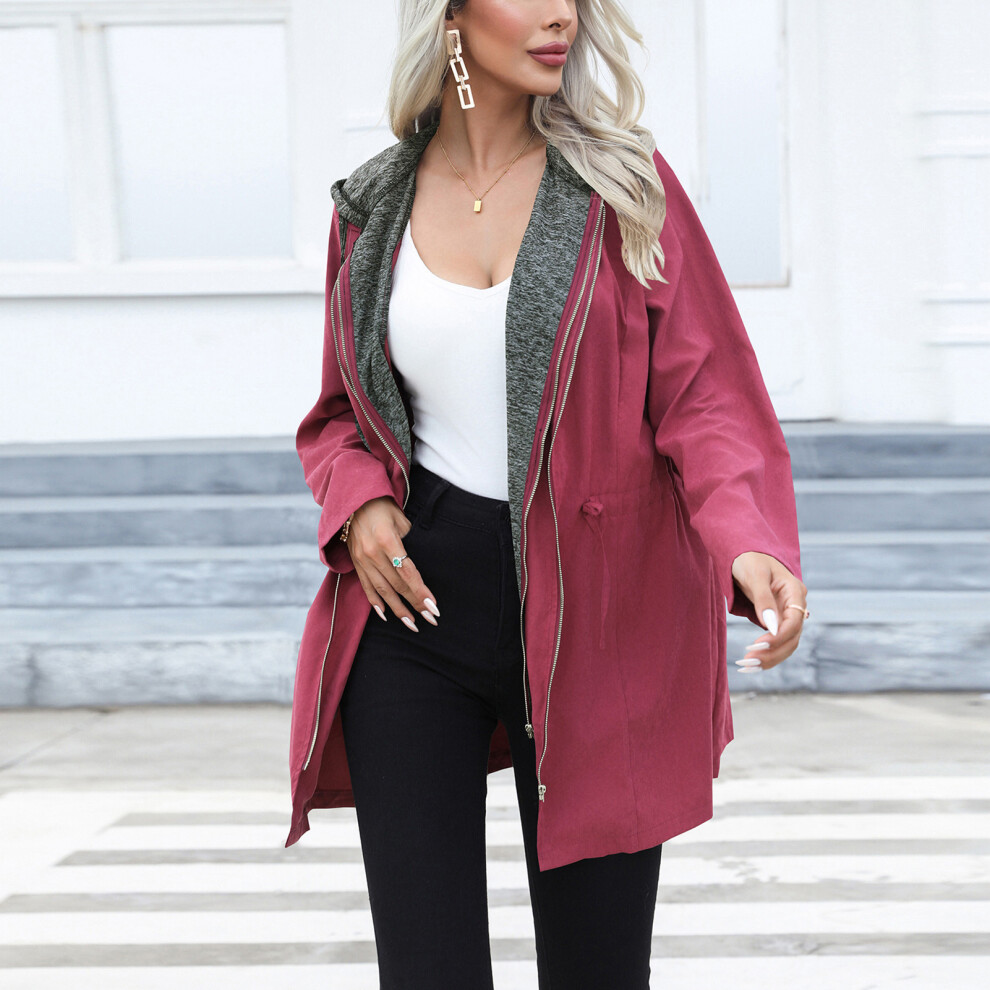 Long Dual Zipper Burgundy Hoodie Coat with Drawstring Waist for Women