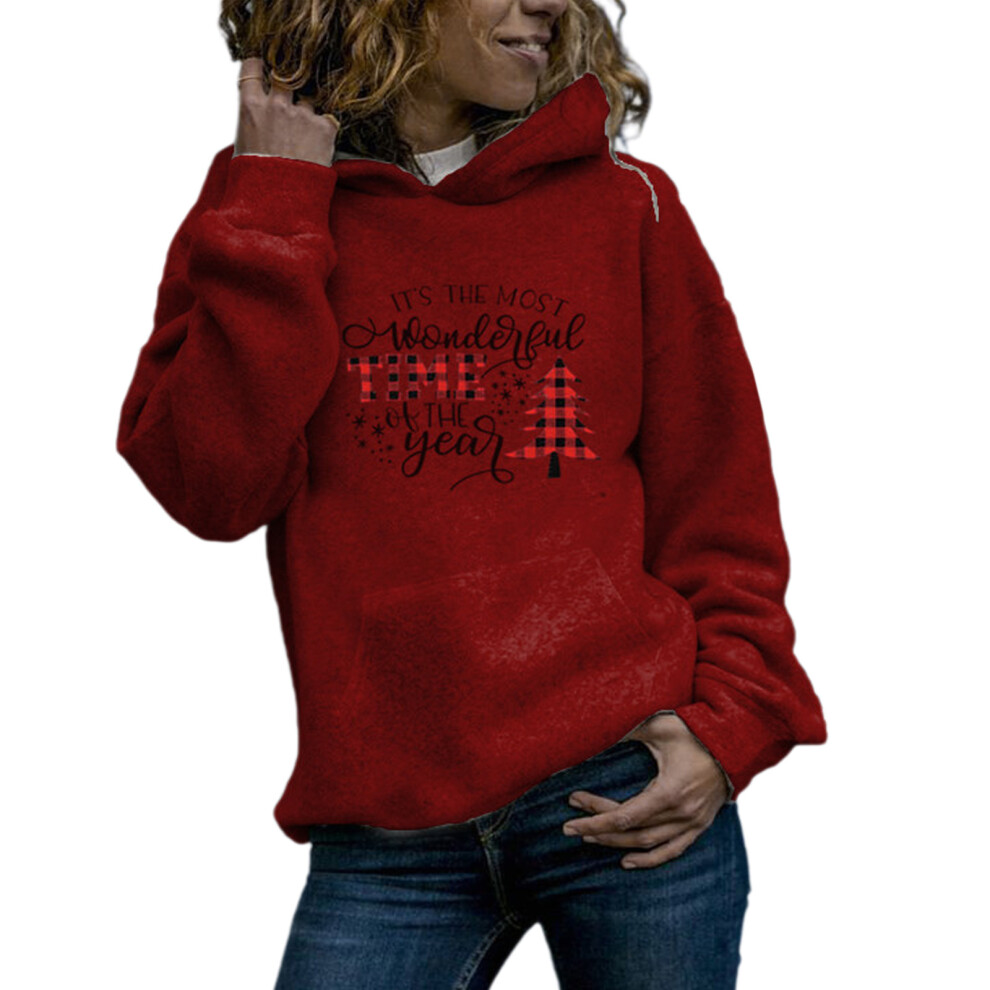 Women Christmas Fleece Hoodie Sweatshirt Long Sleeve-Burgundy S