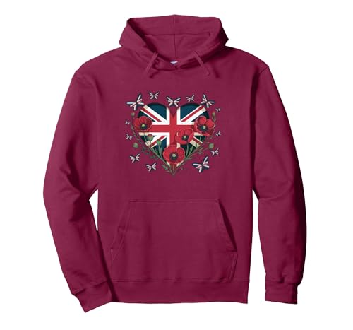 Union Jack Butterflies UK Flag Flowers Women Girl Union Jack Pullover Hoodie, Adult Unisex, Burgundy, Large