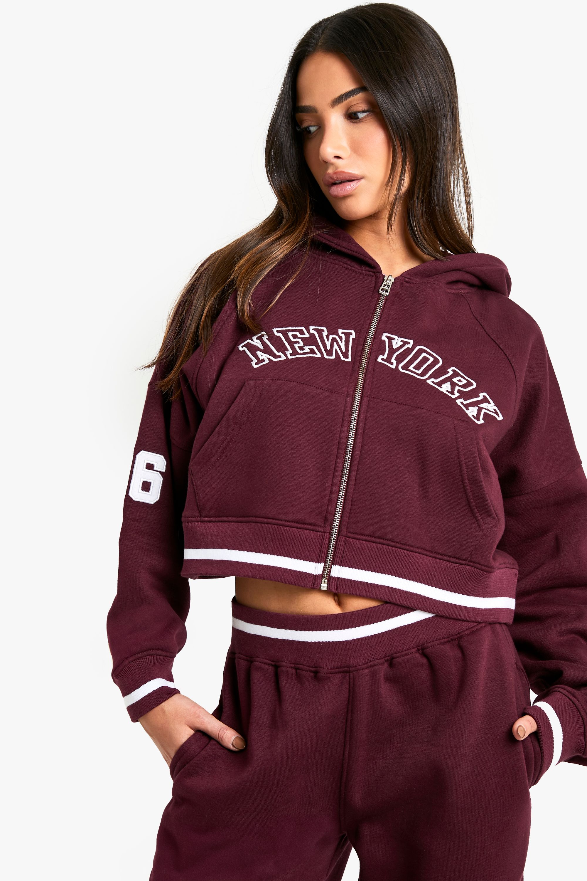 Boohoo Womens Petite New York Embroidered Cropped Zip Through Hoodie - Burgundy Cotton - Size Large
