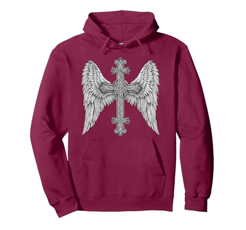 Gothic Cross and Angle Wings Graphic Punk Style Mens Womens Pullover Hoodie, Adult Unisex, Burgundy, X-Large