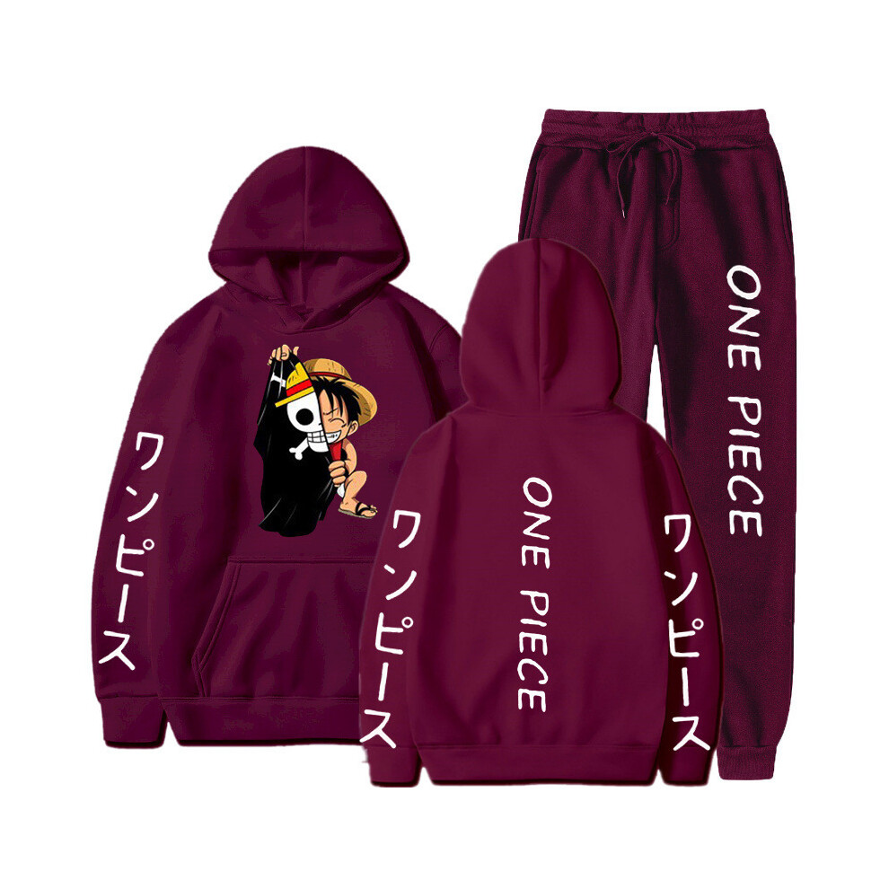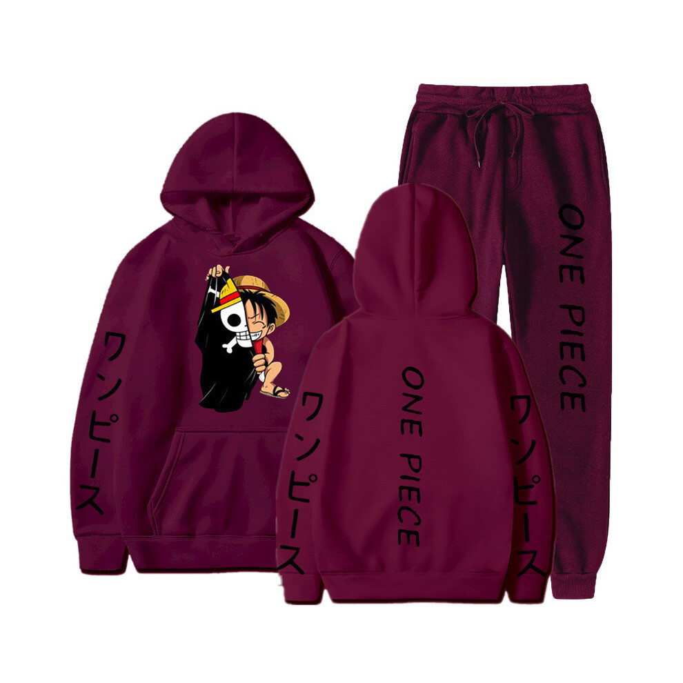 (Burgundy 1, L) One Piece Luffy Hoodie Set (Men's and Women's Sports Sweatshirt + Sweatpants)