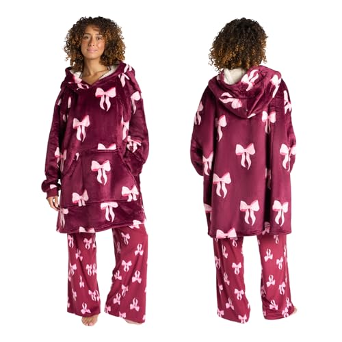 OHS Blanket Hoodie Women Bow Print, Mothers Day Gifts Super Soft Sherpa Fleece Warm Comfy Cosy Oversized Wearable Blanket Sweatshirt Big Pocket for Adults Women Girls, Burgundy/Pink