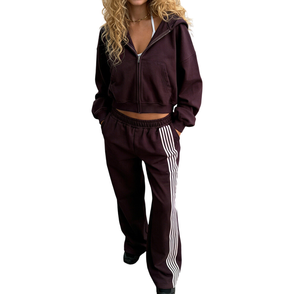 (S, Burgundy) Women's Two Piece Outfits Long Sleeve Hoodie and Striped Print Pants Set Tracksuit