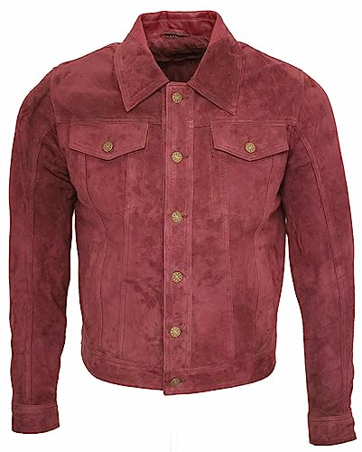 Men's Trucker Casual Goat Suede Burgundy Leather Shirt Jeans Jacket 2XL