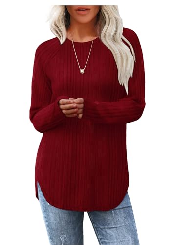 Aokosor Christmas Jumpers for Womens Long Sleeve Tops Ladies Lightweight Sweatshirt Curved Hem Tunic for Leggings Burgundy Red Size 6-8