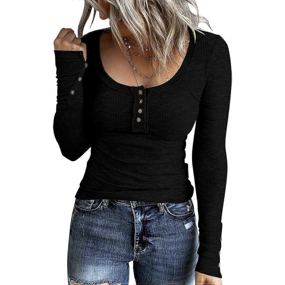 (Large, A1 burgundy) Womens Long Sleeve Henley T Shirts Button Down Slim Fit Tops Scoop Neck Ribbed Knit Shirts