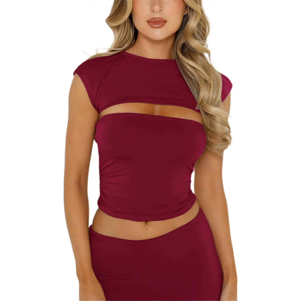 (L, Burgundy) Womens Short Sleeve Detachable 2 Piece Crop Top T-Shirt Summer Female T-shirt Y2K Tops for Club Party Burgundy S