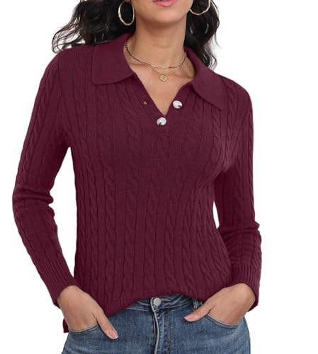GRECERELLE Womens Cable Knit Jumpers Long Sleeve Polo Neck Sweater Tops Casual Pullover Polo Shirts 2025 Fall Fashion Outfits (Burgundy, L)