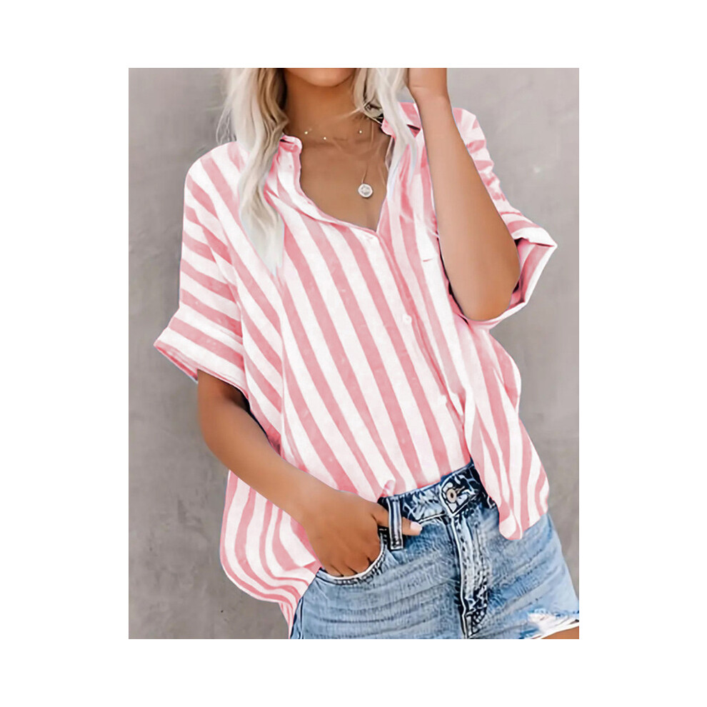 (Burgundy, M) Tops Casual Loose Striped Short-sleeve Shirt For Women Summer Fashion Button Elegant Office Holiday Top Shirts Womens Clothing