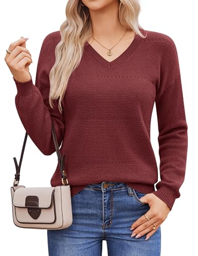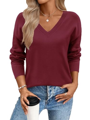 Zeagoo Womens V-Neck Jumpers Long Sleeve Knitted Sweaters Soft Basic Pullover Tops Casual Lightweight Sweatshirts for Autumn Winter Burgundy S