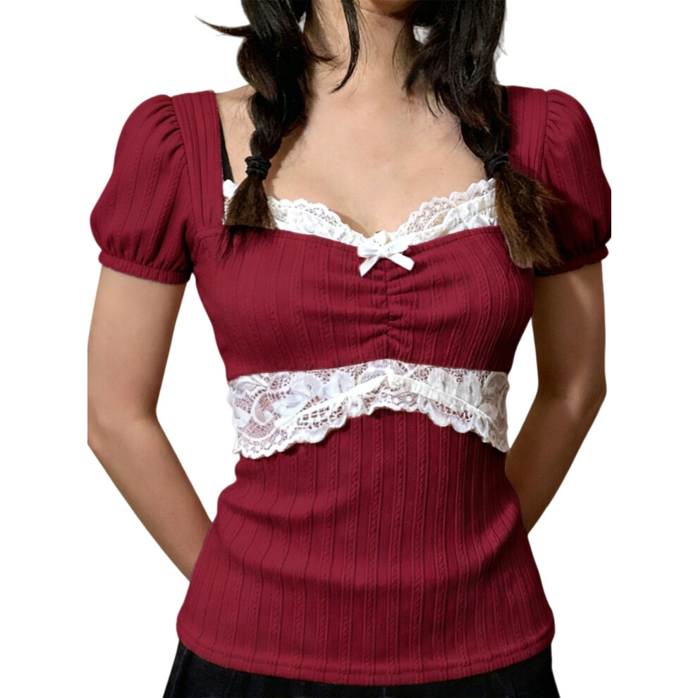(L, Burgundy) Womens Summer Tops Puff Short Sleeve Sweetheart Neck Lace Patchwork Slim Fit Grunge Shirts