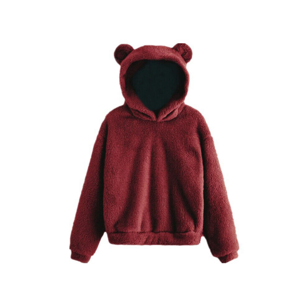 (Burgundy, UK Size 8-10=Tag Size M) Womens Winter Teddy Bear Hooded Sweatshirt Long Sleeve Fluffy Fleece Hoodie Tops