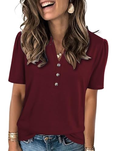 Famulily Womens Henley Tops V Neck Button Dressy Blouse Summer Floaty Longline Shirts Burgundy M