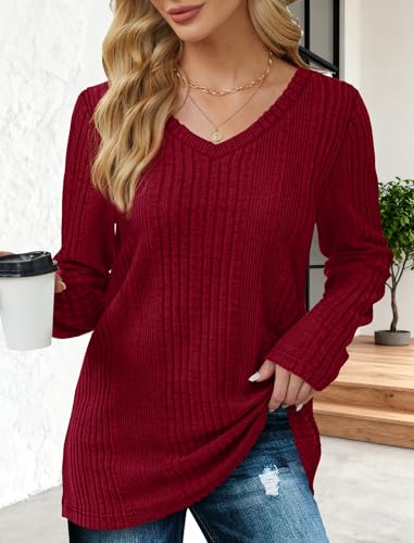 Womens Long Sleeve Tops V Neck Shirts Lightweight Tunic Sweaters Fashion 2025, Burgundy, X-Large