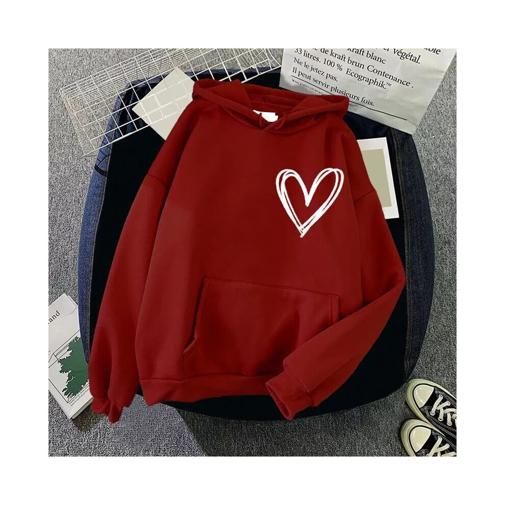 (Burgundy, UK Size 12=Tag Size L) Womens Heart Print Hoodie Tops Ladies Casual Baggy Long Sleeve Hooded Sweatshirt
