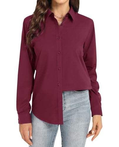 J.VER Womens Shirts Stretch Long Sleeve Regual Fit Plain Cotton Button Down Shirt Business Work Office Tops Wrinkle Free Ladies Blouse Burgundy S