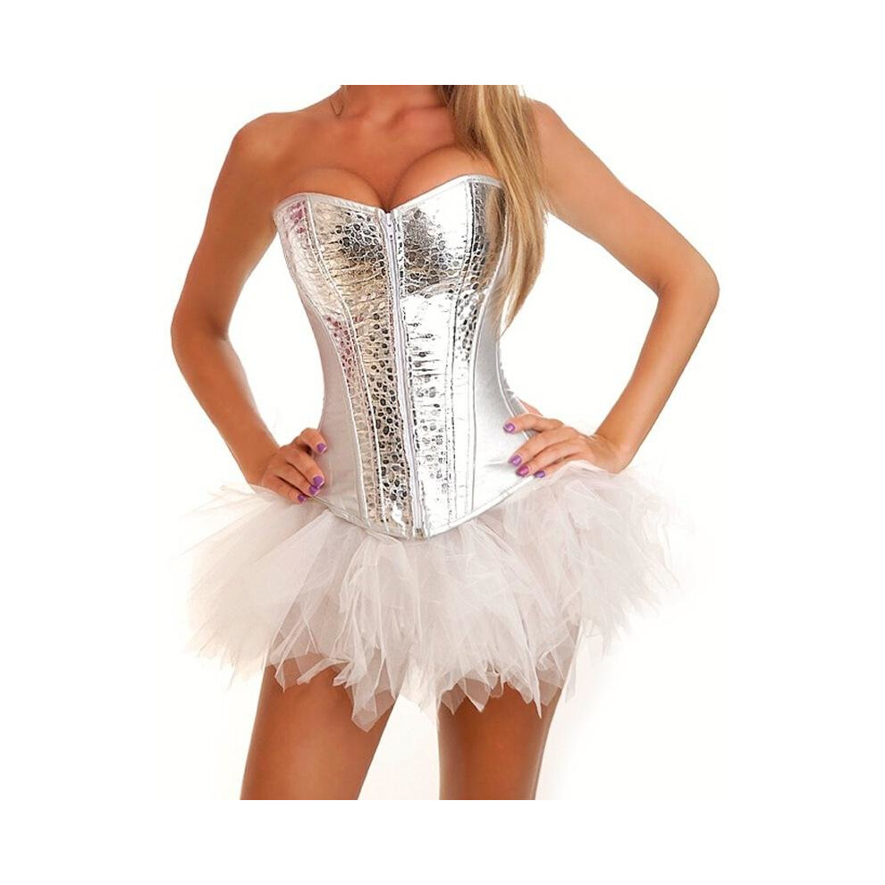 Silver PVC Leather Zipper Corsets And Bustiers Sexy Dress Gothic Corset Skirt Burlesque Costumes For Women Dance Party Club Wear