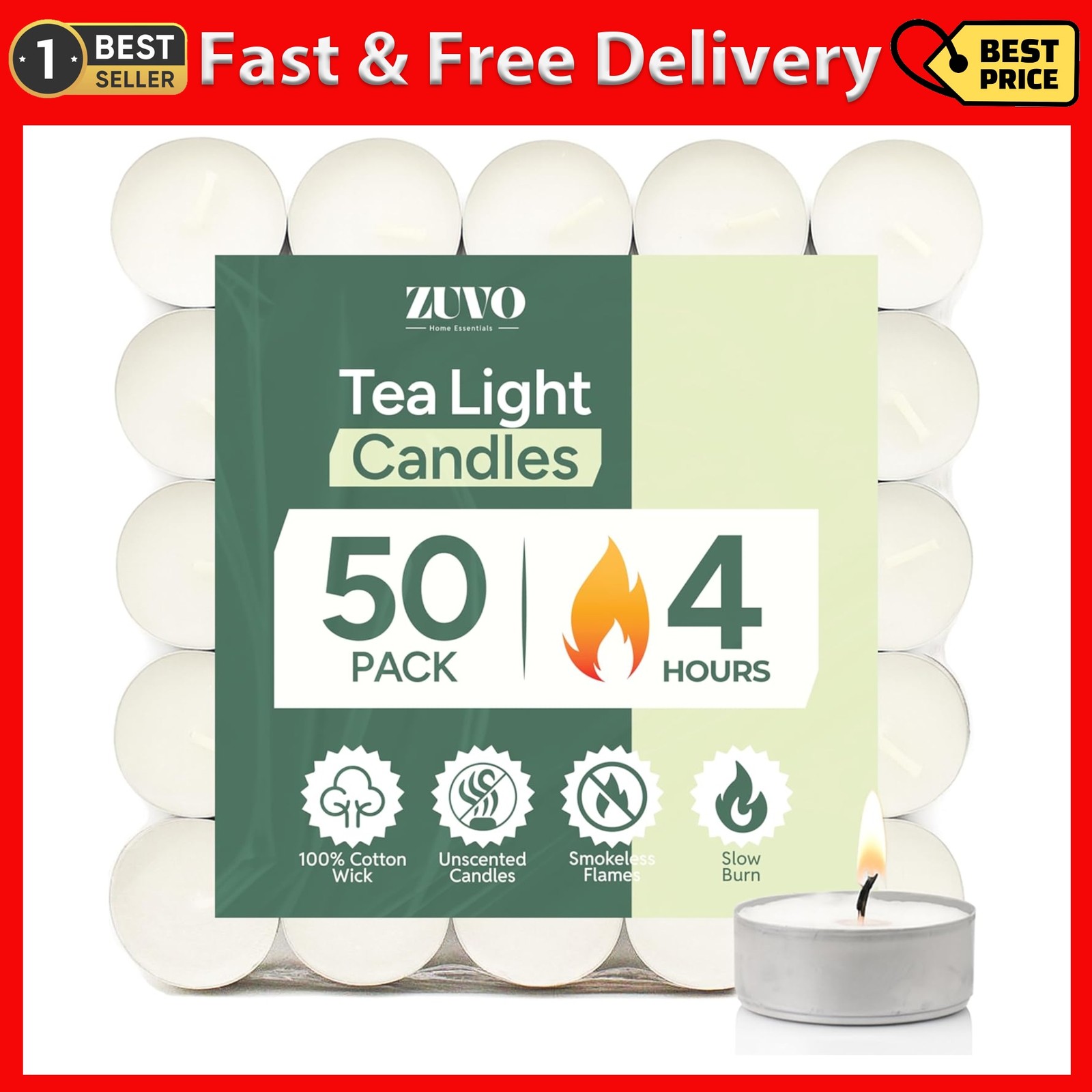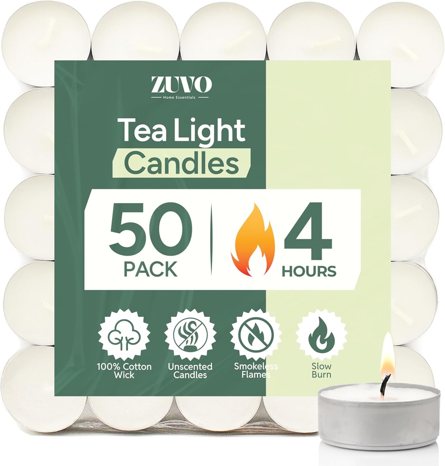 Tea Lights Candles 4 Hour Burn (100 Pack) - White t Lights - Unscented 3.8 x 2.3 cm - 4hr - Zuvo & delka 8 Hour Tea Light Candles, 50 Pack, Long Burning Time, Unscented Tea Lights - White