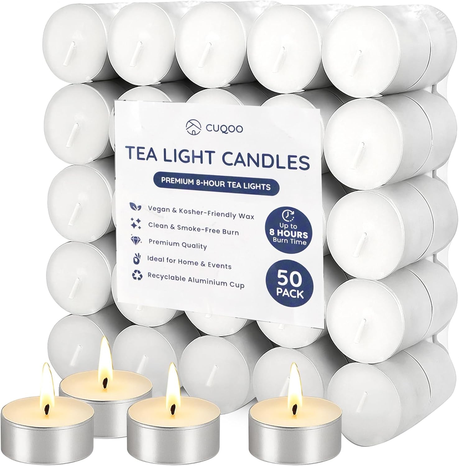 CUQOO Tea Lights 8 Hour Burn 50-Pack Unscented Tealight Candles – 8hr Long Burning Vegan Smokeless Tea Light Small White Candles for Wax Burners, Home, Weddings & Emergency Use