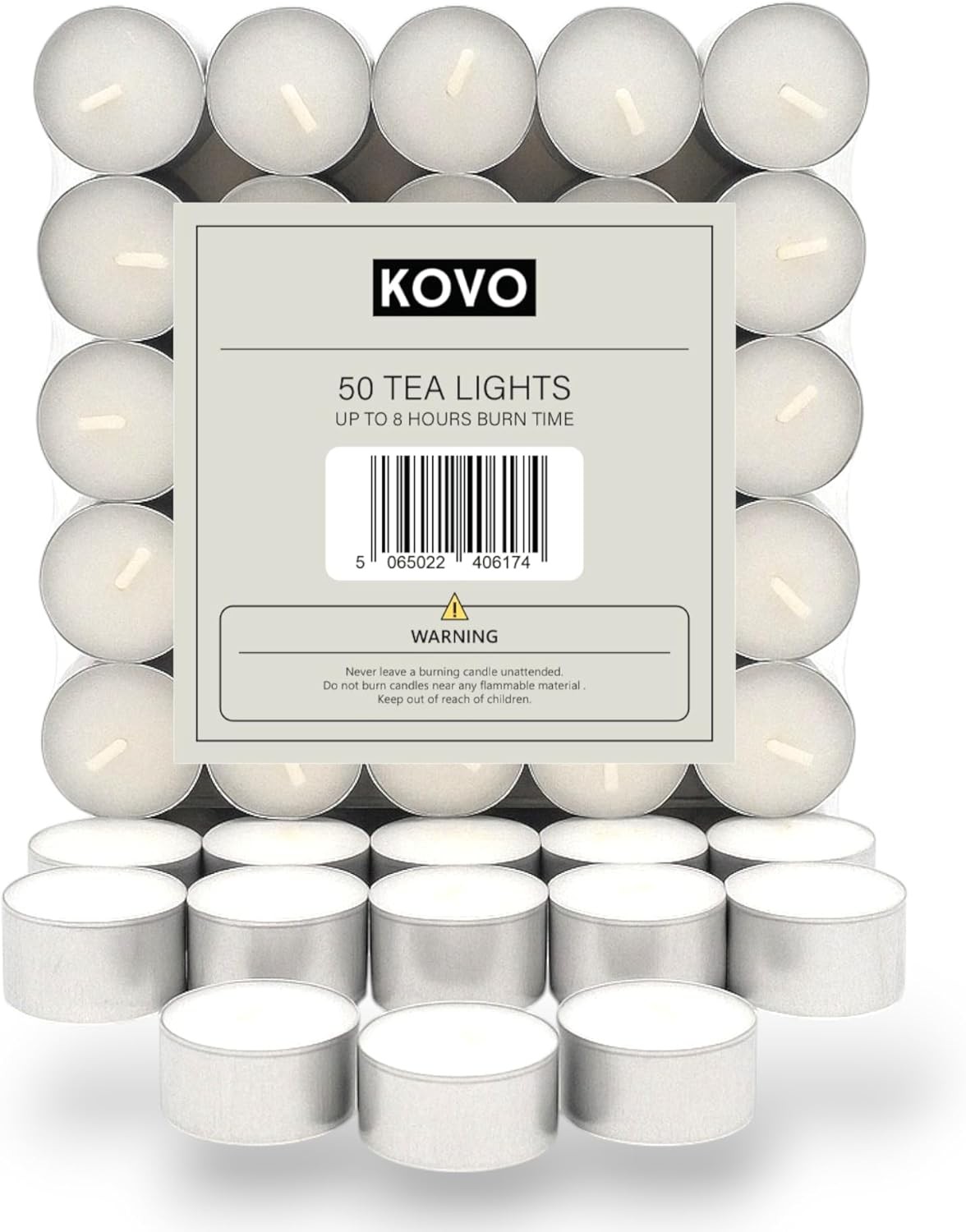 KOVO Tea Light Candles 8 Hour Burn 50 Pack - Long Lasting Unscented TeaLights - Ideal for Weddings, Parties, Restaurants, Aromatherapy - Large, Durable - Smokeless, Clean Burn - Premium Candles