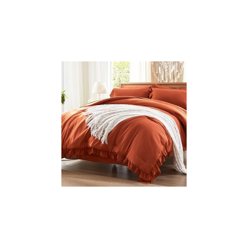 7-Pc Queen Comforter Set in Burnt Orange, Shabby Chic Ruffle Bedding with Sheets & Pillowcases