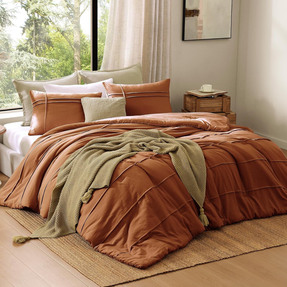 Terracotta Queen Comforter Set, 3-Piece Burnt Orange Bedding with Pinch Pleat Design & 2 Shams (90"x90")