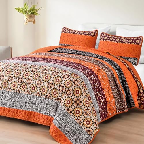 WONGS BEDDING Boho King Size Bedspread Set for Autumn, Orange (Burnt Orange) Bohemian Striped Patchwork Bedspread Set with 2 Pillowcases, Lightweight Microfiber Floral Bedding Set, 264 x