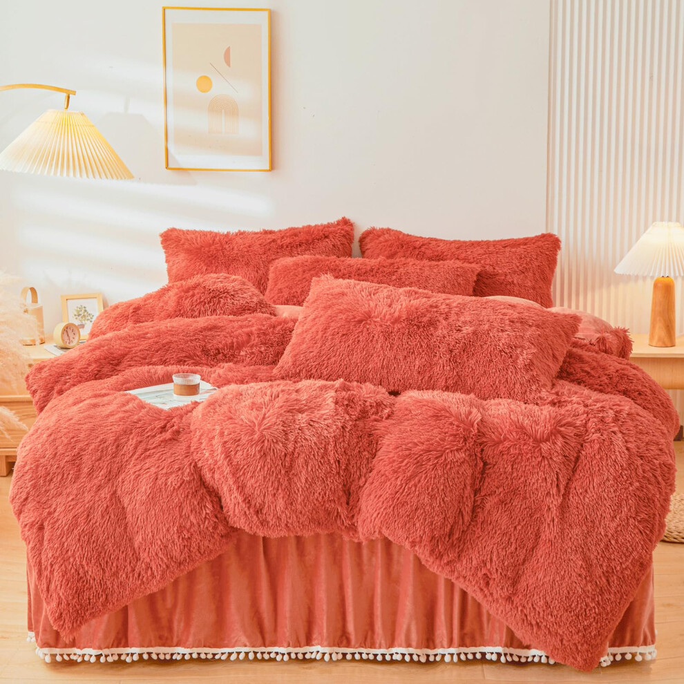 Fluffy Orange Comforter Cover Set Queen, 3-Pc Ultra Soft Plush Burnt Orange Bedding (1 Duvet + 2 Pillowcases), Boho Dark Orange