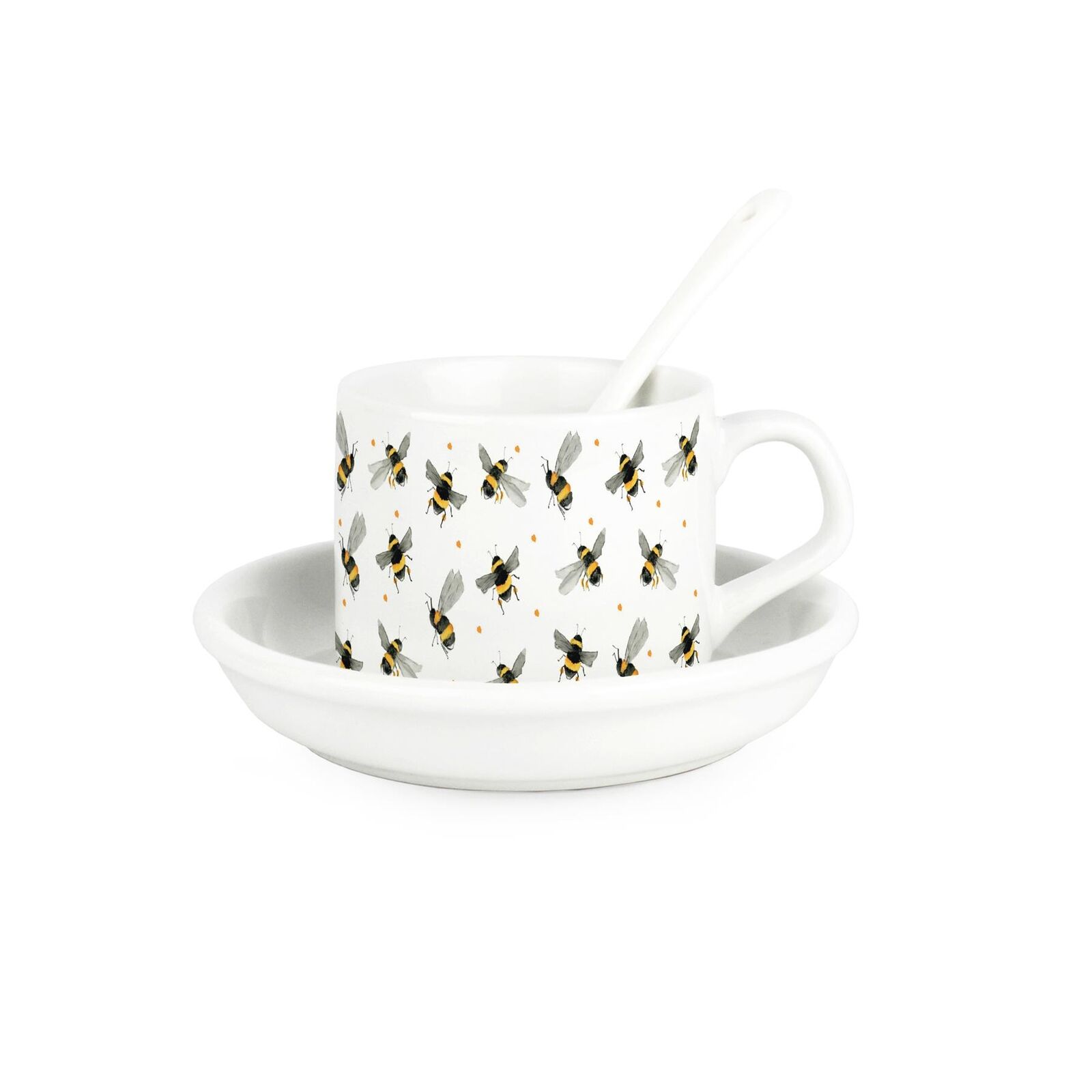 Scattered Bees Ceramic Cup & Saucer Set with Spoon - Tea/Coffee Bumblebee Gift