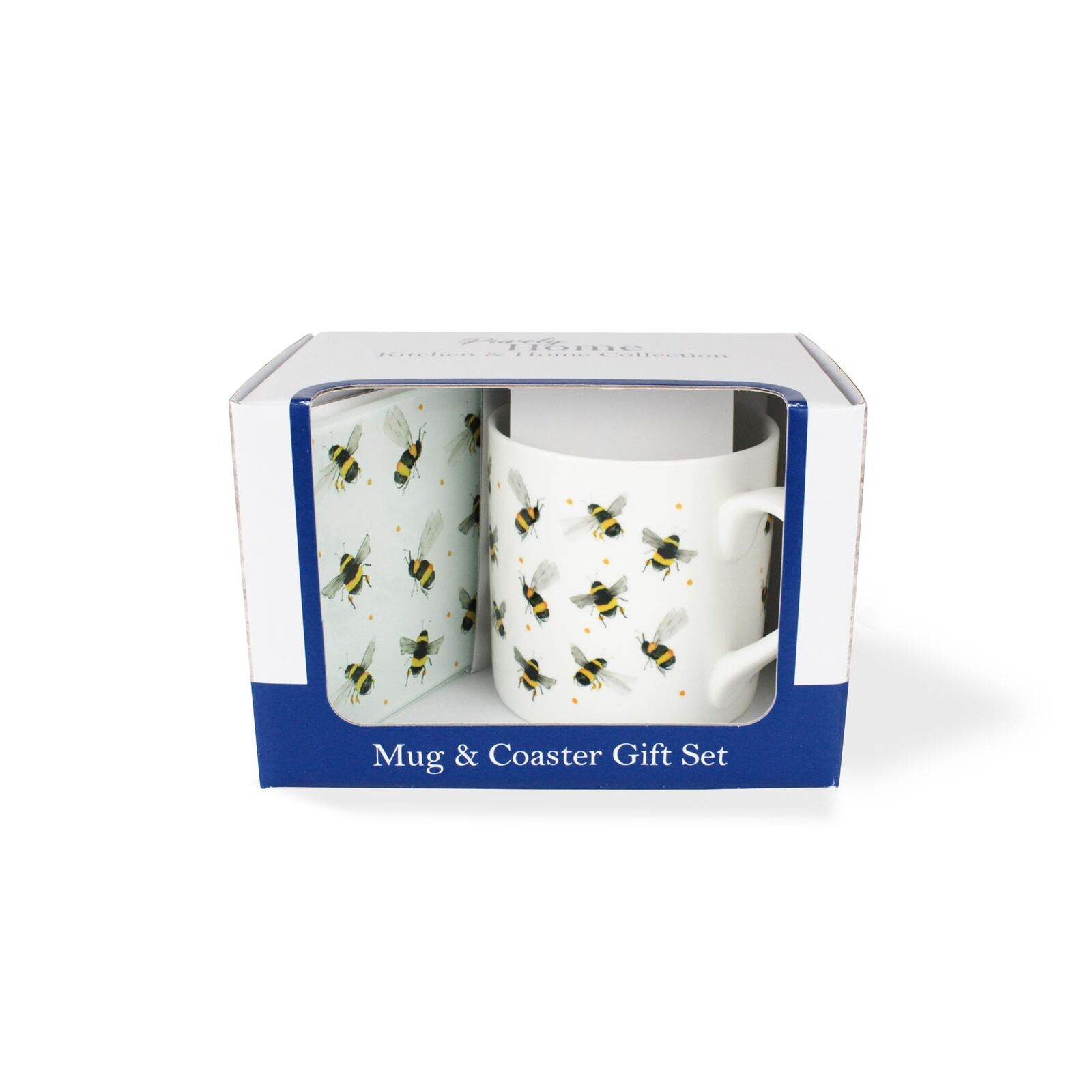 Scattered Bees Mug & Coaster Gift Set - Bone China/Glass Presents for Bee Lovers